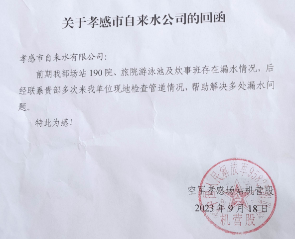 除此之外,再與工作人員的溝通中我們得知,該院內(nèi)新建的一處游泳池一直無法通水,秉持著讓用戶滿意的服務(wù)理念,我公司技術(shù)人員馬不停蹄義務(wù)幫助其查明原因,恢復(fù)正常通水,解決了用戶的各種用水問題。事后,為了感謝我公司高效率高質(zhì)量的為民服務(wù),空軍孝感廠站機營股工作人員特意送來了感謝信。